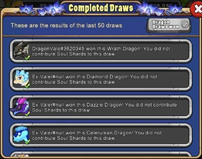 - Initially, the list of completed draws showed the user Ex-Valer#null winning a Tree Dragon, Lightmatter Dragon, Daylily Dragon, Flickerflame Dragon, Lunis Dragon, Glyph Dragon, Apex Dragon, Iden Dragon, Burglehoo Dragon, Canvas Dragon, Kaiju Dragon, Regal Dragon, Opal Dragon, Quantum Dragon, Triple Leap Year Dragon, Celerulean Dragon, Dazzle Dragon, and Diamond Dragon.